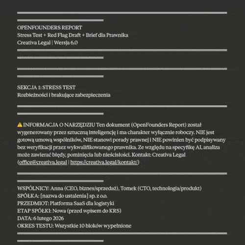 Odbiór pakietu - System generuje raport oraz szkielet Twojej umowy wspólników z komentarzami i flagami. Dostajesz Mapę Niezgodności, która pokazuje, gdzie „gracie w inne gry”.